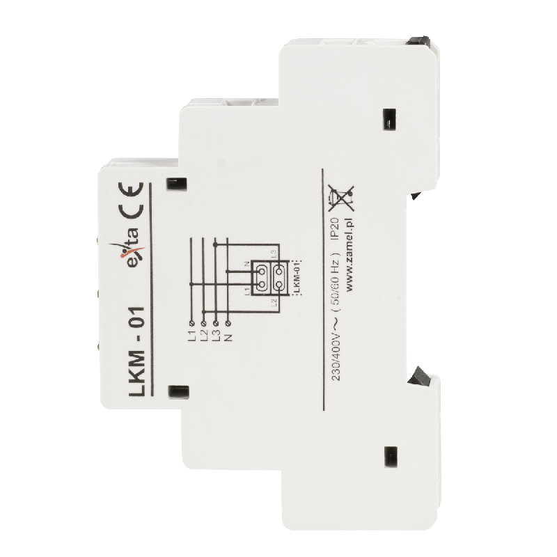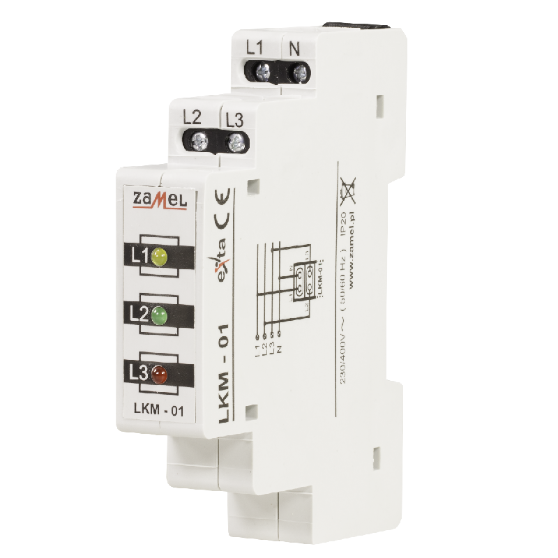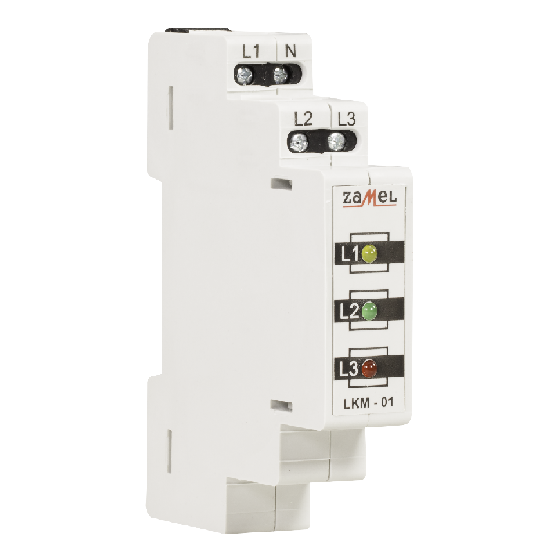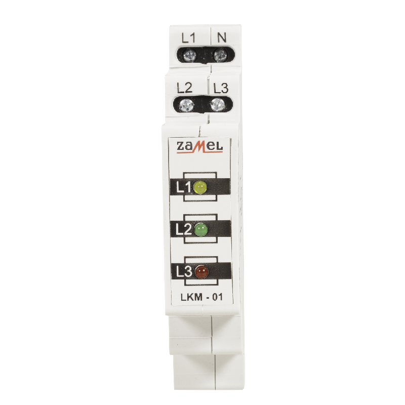 Wskaźnik zasilania LKM-01-40 służy do sygnalizacji napięcia w sieci trójfazowej. Sygnalizacja realizowana jest przy pomocy trzech diod LED oznaczonych L1, L2, L3. Dostępne są cztery wersje kolorystyczne diod LED (mieszana). Wskaźnik zasilania LKM-01-30 może być zastosowany w sieci TNC (z punktem zerowym).